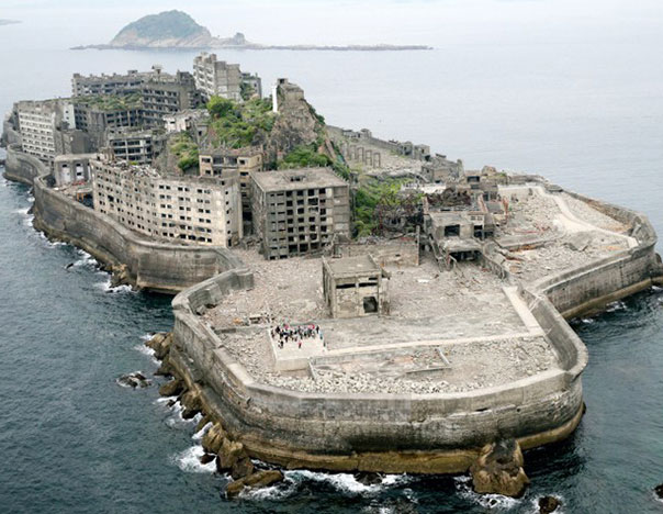 La isla de Hashima en el Japón, se construyó a raíz del descubrimiento de yacimientos de carbón en subsuelo marino, y tuvo su gran auge durante el periodo entre las dos guerras mundiales, donde incluso se construyeron grandes edificios residenciales tipo condominios, y se adecuó una serie de muelles y fortificaciones para protegerlas del alto oleaje existente en el mar; después de que la extracción se vino abajo y tras la derrota del imperio japonés en la segunda guerra mundial, inició el abandono de sus habitantes; en la actualidad y en medio del mar, sirve como museo viviente.