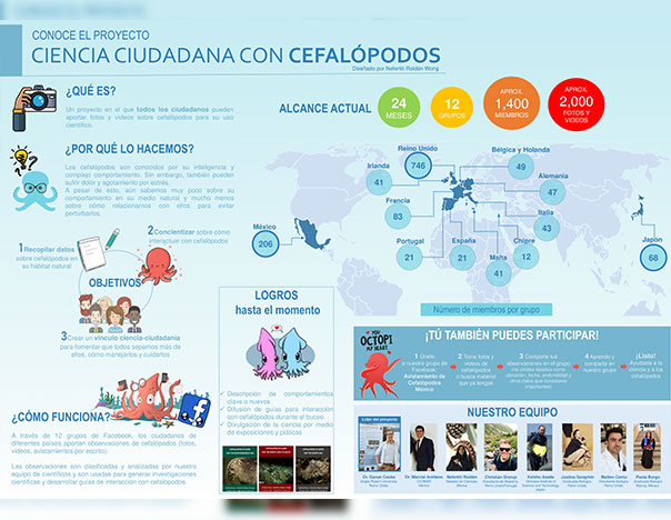 “Asimismo, aunque existen más de 800 especies de cefalópodos distribuidas en todos los océanos del mundo, estudiarlos en su medio natural es muy costoso y complicado porque sus poblaciones son impredecibles y se esconden muy bien de los humanos. Por todas estas razones, el Dr. Gavan Cooke, profesor de la Universidad de Anglia Ruskin, en Reino Unido, tuvo la idea de crear el proyecto Ciencia Ciudadana con Cefalópodos. Este proyecto funciona a través de grupos de Facebook, a los cuales puede unirse cualquier ciudadano y aportar fotografías, videos o información cada vez que se encuentran con algún cefalópodo en su día a día, ya sea nadando, buceando, pescando o desde la playa.” –explica Nefertiti.