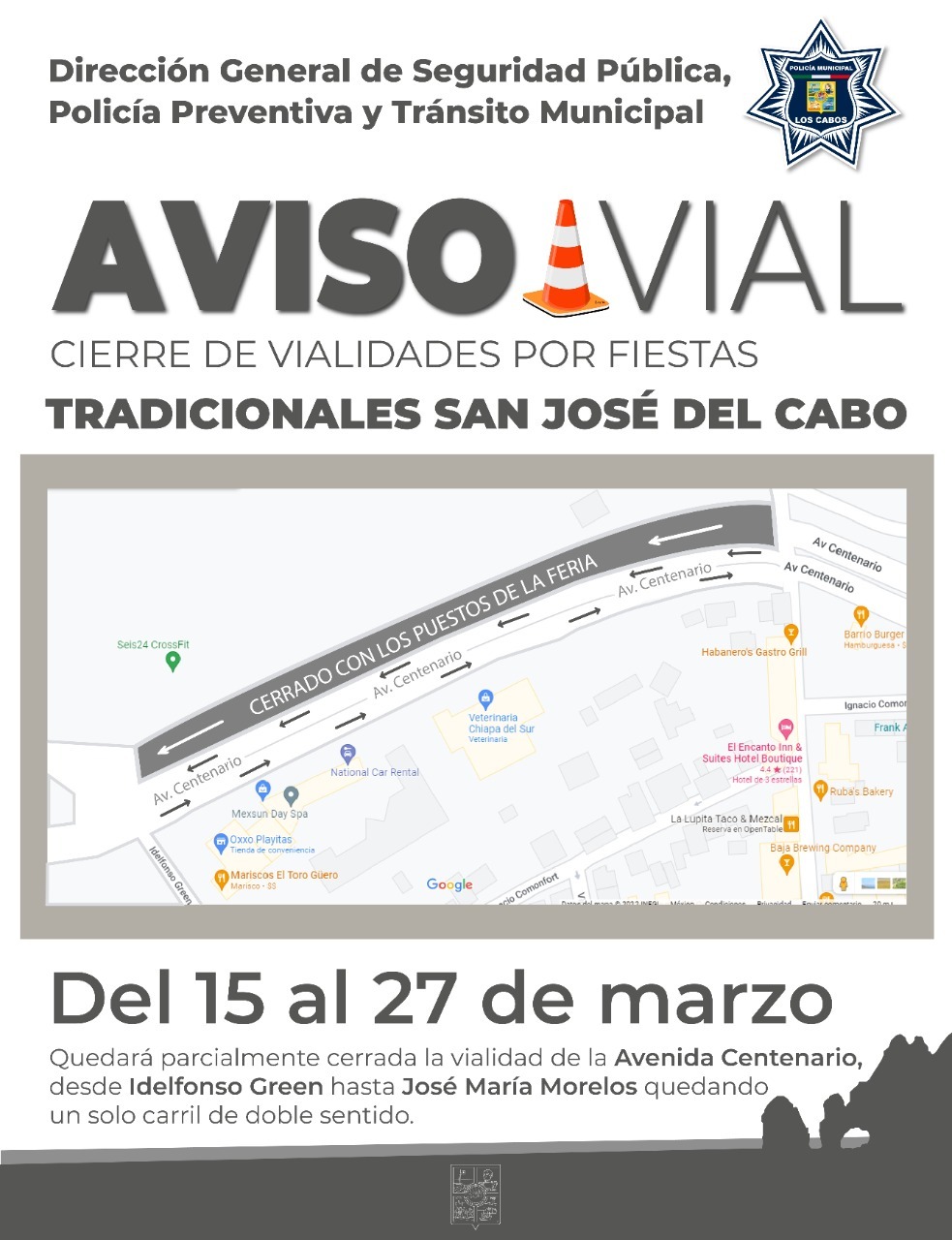 San José del Cabo, Baja California Sur (BCS). El Gobierno de Los Cabos informa por medio de un comunicado de prensa, que debido a los preparativos y celebración de las Fiestas Tradicionales San José del Cabo 2022, a partir de este martes 15 de marzo, inicia el cierre parcial de la avenida Centenario, desde la calle Idelfonso Green hasta la calle José María Morelos.