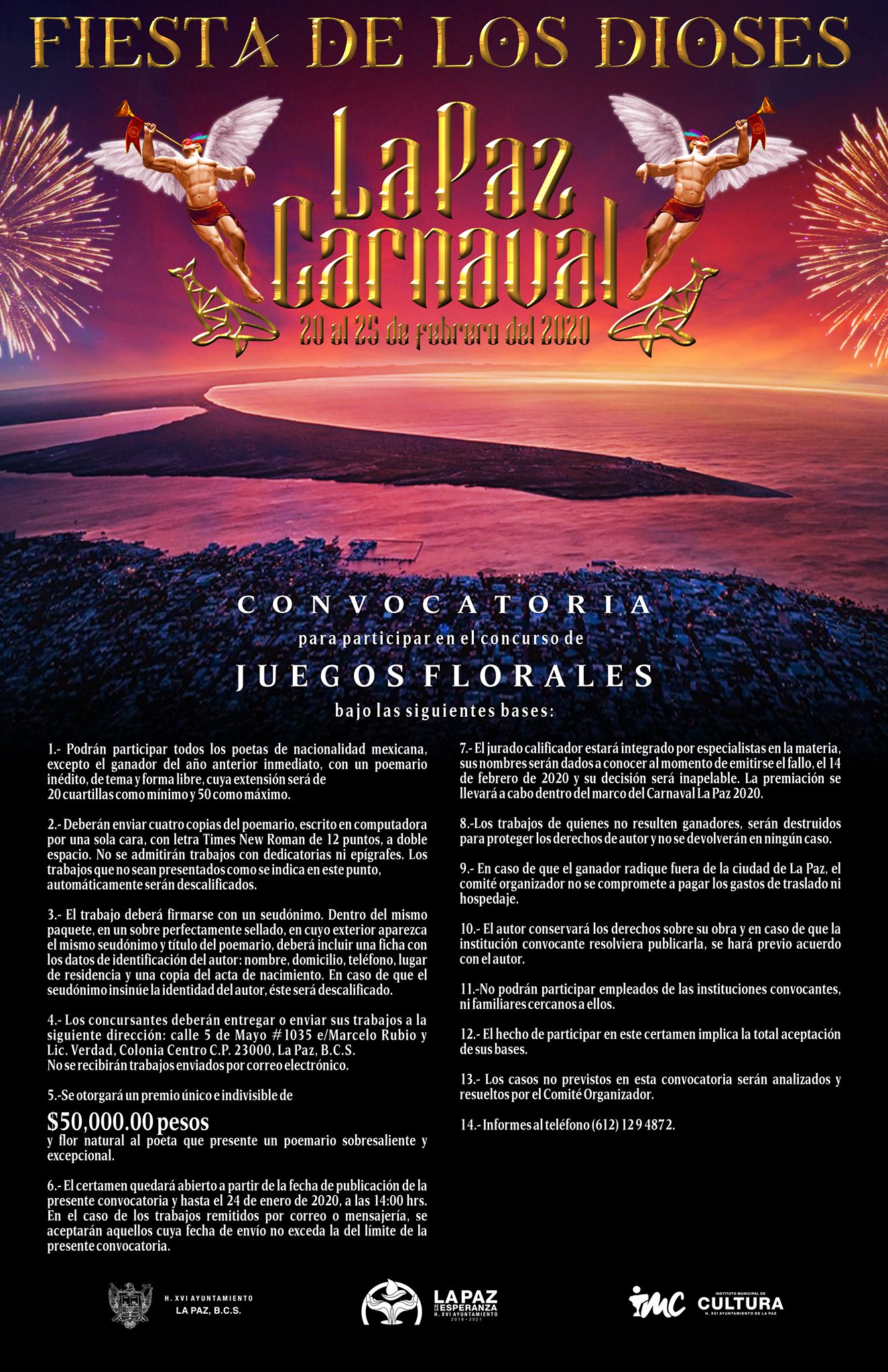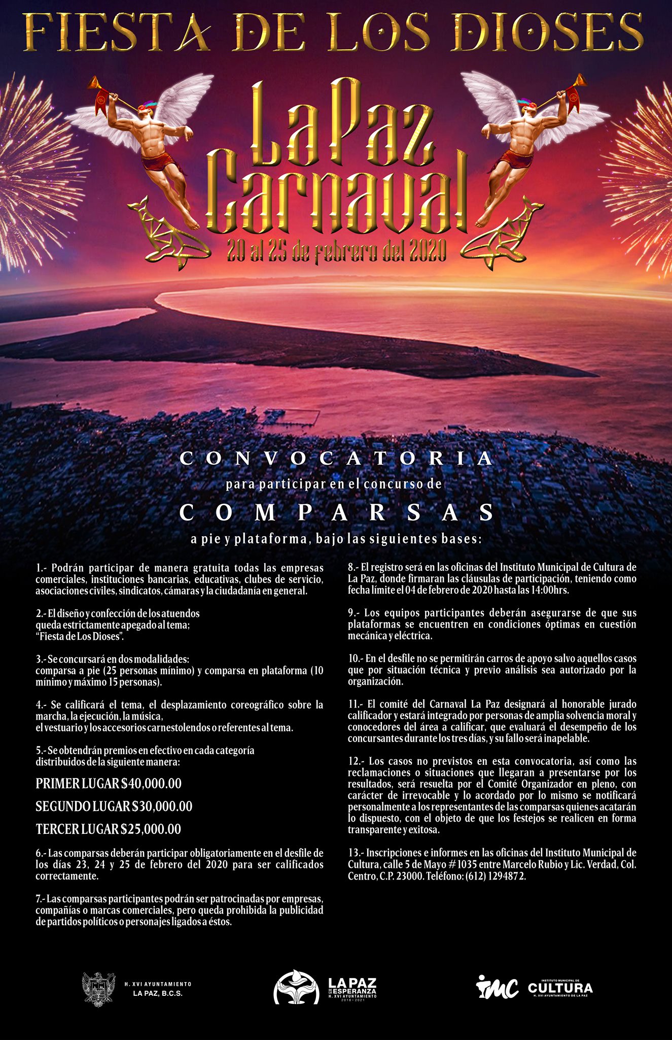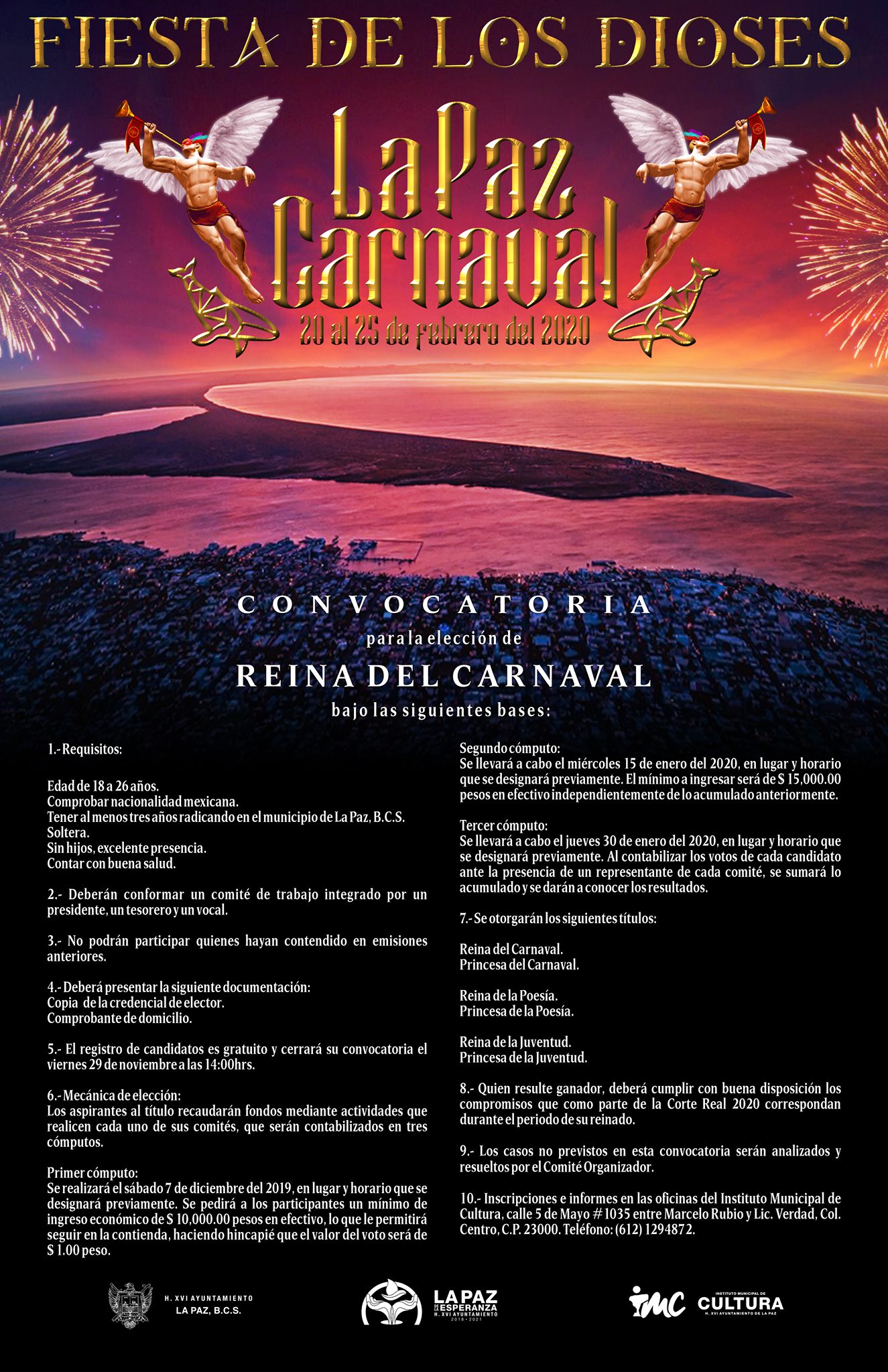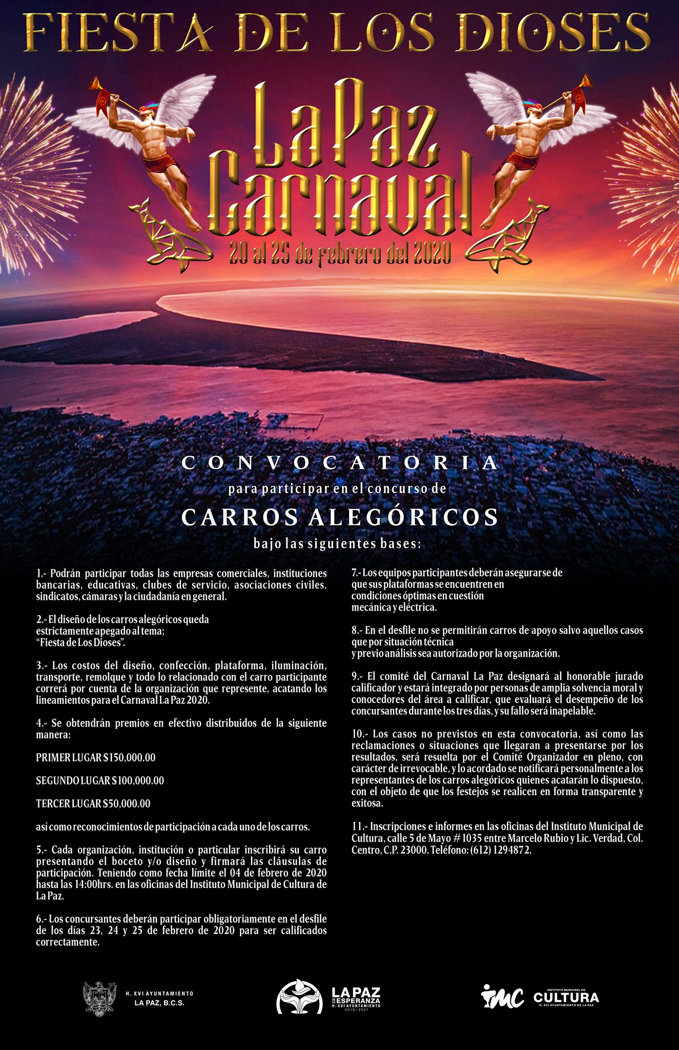 Por su parte, el ahora Presidente del Comité de Carnaval La Paz 2020, expresó que las convocatorias a Reina del Carnaval, Rey de la Alegría, Carros Alegóricos, Comparsas y Juegos Florales, quedan abiertas a partir de la fecha, por lo que la ciudadanía podrá encontrarlas en la página oficial del Carnaval La Paz.