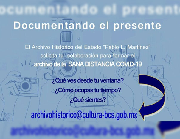 Con la finalidad de preservar las vivencias de esta pandemia desde el punto de vista de los habitantes de Baja California Sur para las futuras generaciones, el Archivo Histórico de Baja California Sur está solicitando imágenes, videos o grabaciones que los sudcalifornianos hayan tomado en estos días de aislamiento, con enfoque en el cumplimiento de las indicaciones de sana distancia y la aplicación del #QuédateEnCasa para disminuir los contagios por el coronavirus COVID-19.