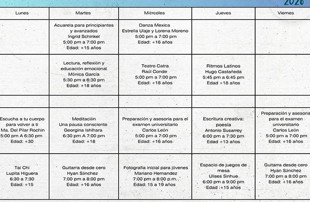 Para el Bloque 20-26, el abanico de más de 20 talleres gratuitos incluye: Taichi; Escucha tu cuerpo para volver a ti; Acuarela para principiantes y avanzados; Lectura, reflexión y educación emocional; Meditación, una pausa consciente; Guitarra desde cero; Teatro Catra; Danza Mexica; Preparación y asesoría para el examen universitario; Fotografía inicial para jóvenes; Ritmos latinos; Poesía; Espacio de juegos de mesa; Bibliotaller para peques; Muay Thai; Caricatura y dibujo digital; Corto matiné para peques; Iniciación a pintura y dibujo; Pintura para intermedios y avanzados; Introducción al arte circense; y Juegos tradicionales “El Recreo”, además de otros proyectos piloto y actividades que se incorporarán a lo largo del año.