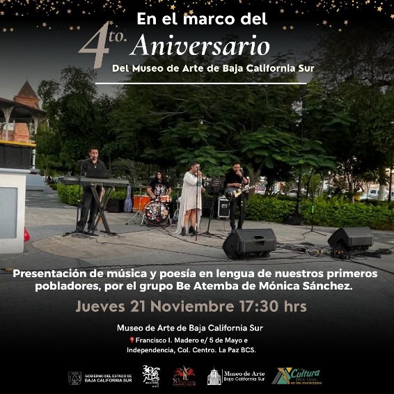 La Paz, Baja California Sur (BCS). El Instituto Sudcaliforniano de Cultura (ISC), te invita a asistir este jueves 21 de noviembre, a las 17:30 horas, a un evento especial con motivo del cuarto aniversario del Museo de Arte de Baja California Sur (MUABCS), en el cual el grupo Be Atemba, liderado por Mónica Sánchez, presentará una cautivadora mezcla de música y poesía en lenguas originarias de los primeros pobladores de la región.