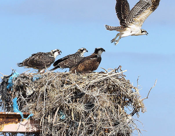 Otras de las características del águila pescadora que menciona el grupo científico es la construcción de sus nidos, que, en ambientes naturales, suele hacerlo en lo alto de acantilados, árboles o cardones, y en raras excepciones directamente sobre el suelo, cuando no existen depredadores naturales, como es el caso de las islas. No obstante, también suelen utilizar diferentes estructuras artificiales, tales como postes eléctricos y de teléfono, boyas, chimeneas, torres de navegación.