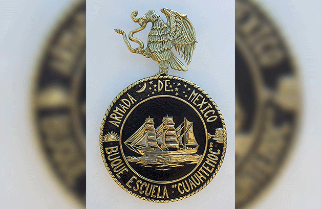 Finalmente, tuve la oportunidad de que se me explicara la simbología que encierra el escudo de este hermoso Buque Escuela, la cual es la siguiente: el cuerpo del escudo se constituye por dos círculos concéntricos, el exterior, a semejanza de un cabo de abacá, significa la jarcia de labor, elemento principal de la tripulación en las faenas de largar y cargar el aparejo. El círculo interior sirve para dividir concéntricamente la circunferencia total del cuerpo. La parte interna de estos lleva en su centro la silueta del Buque Escuela Cuauhtémoc por su babor y con todo el aparejo dado, navegando hacia el poniente, impulsado por el viento, situación que representa su primer viaje para incorporarse a su patria.